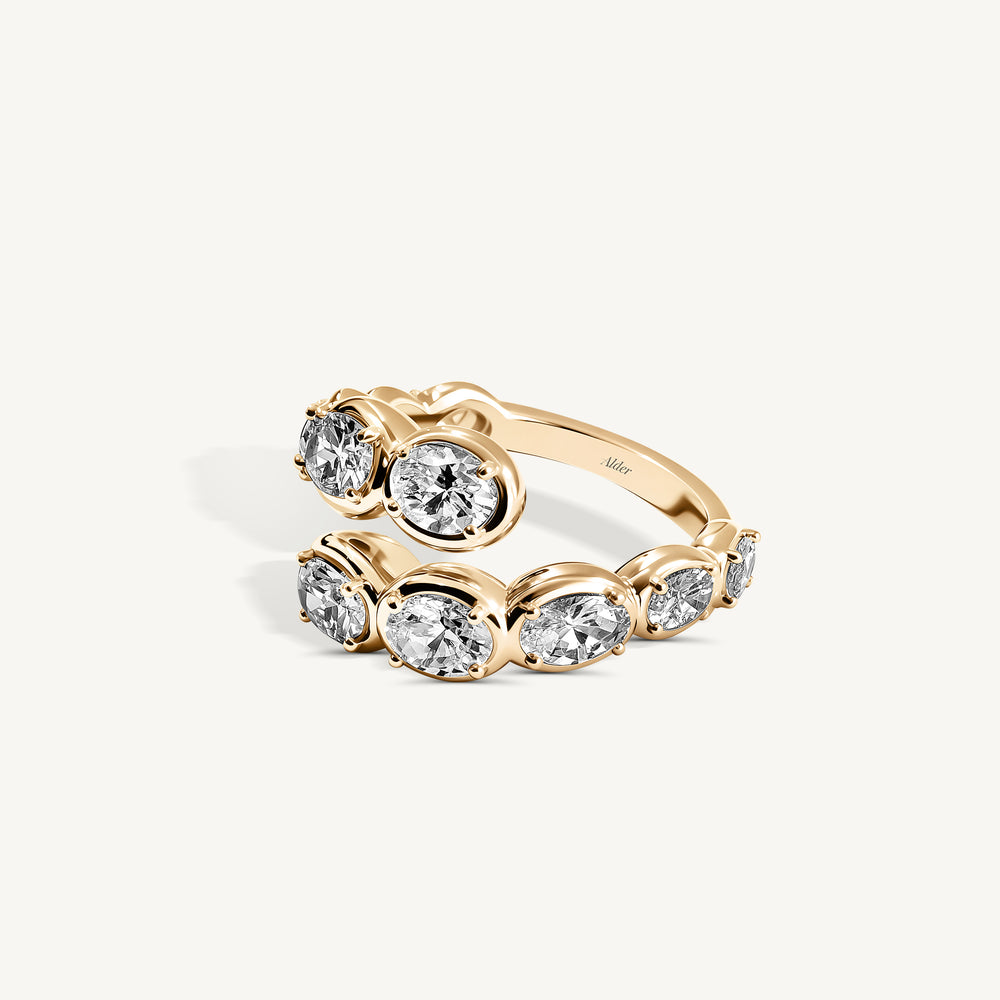 Striking in form and balance, the Oval Diamond Lunar Bypass Ring features 2.98 carats of oval-cut diamonds, elegantly wrapped around the finger in a fluid, open design. Each diamond is meticulously set in 18K yellow gold, creating a play of symmetry and movement that feels both modern and timeless. Sculptural yet wearable, this piece embodies Alder’s signature approach to everyday luxury — bold, feminine, and endlessly refined.