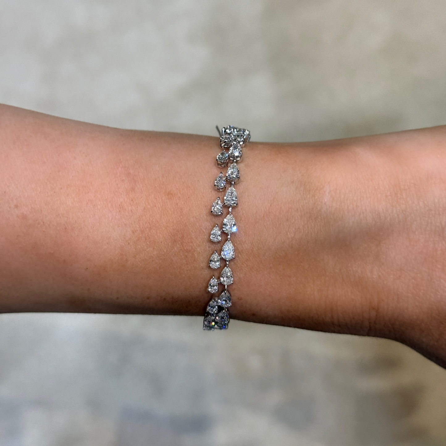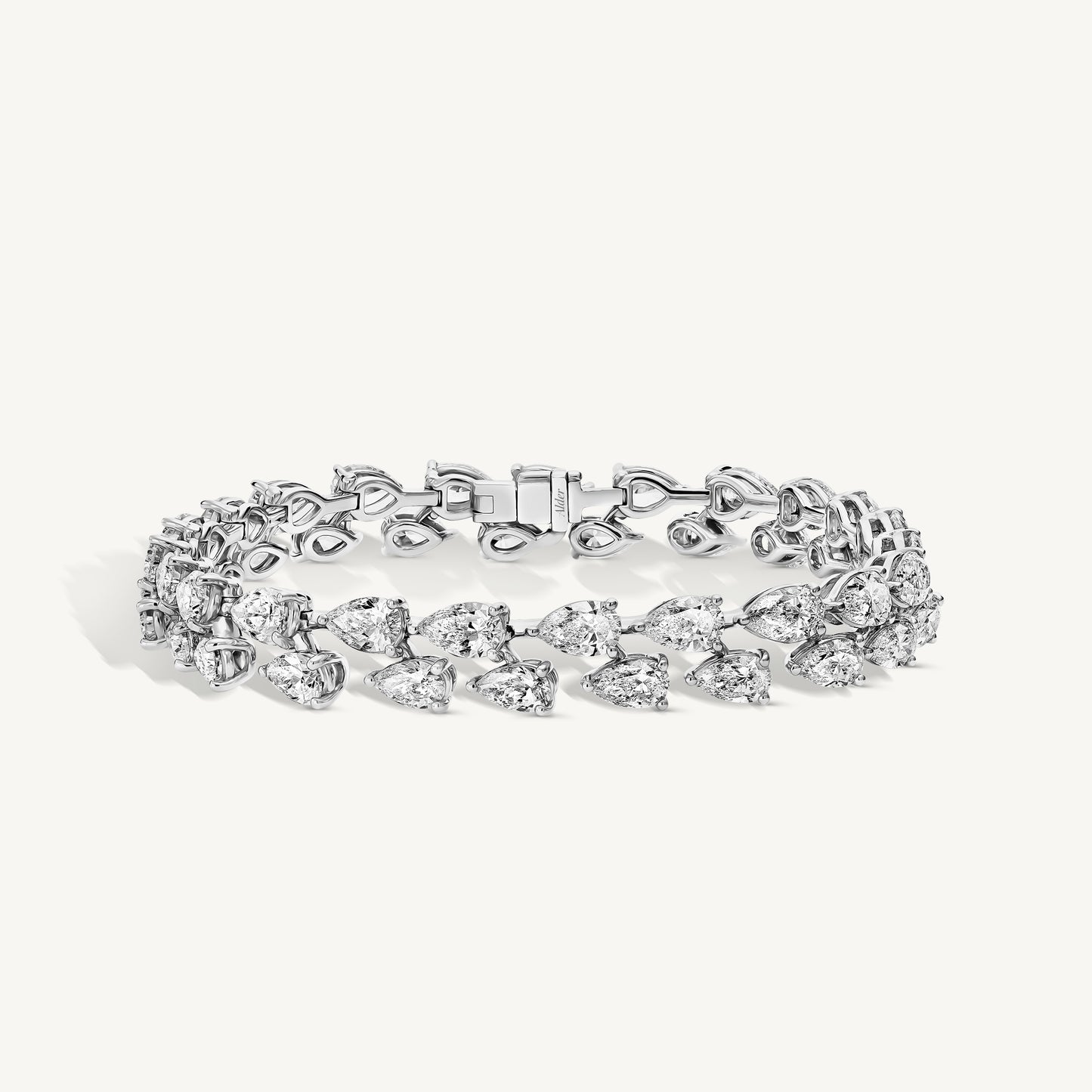 An extraordinary expression of elegance and brilliance, this Double Line Pear Diamond Tennis Bracelet features a mesmerizing cascade of pear-cut diamonds, totaling 11.50 carats. Set in luminous 18k gold, each diamond is meticulously arranged to create a fluid silhouette that wraps the wrist in pure light.