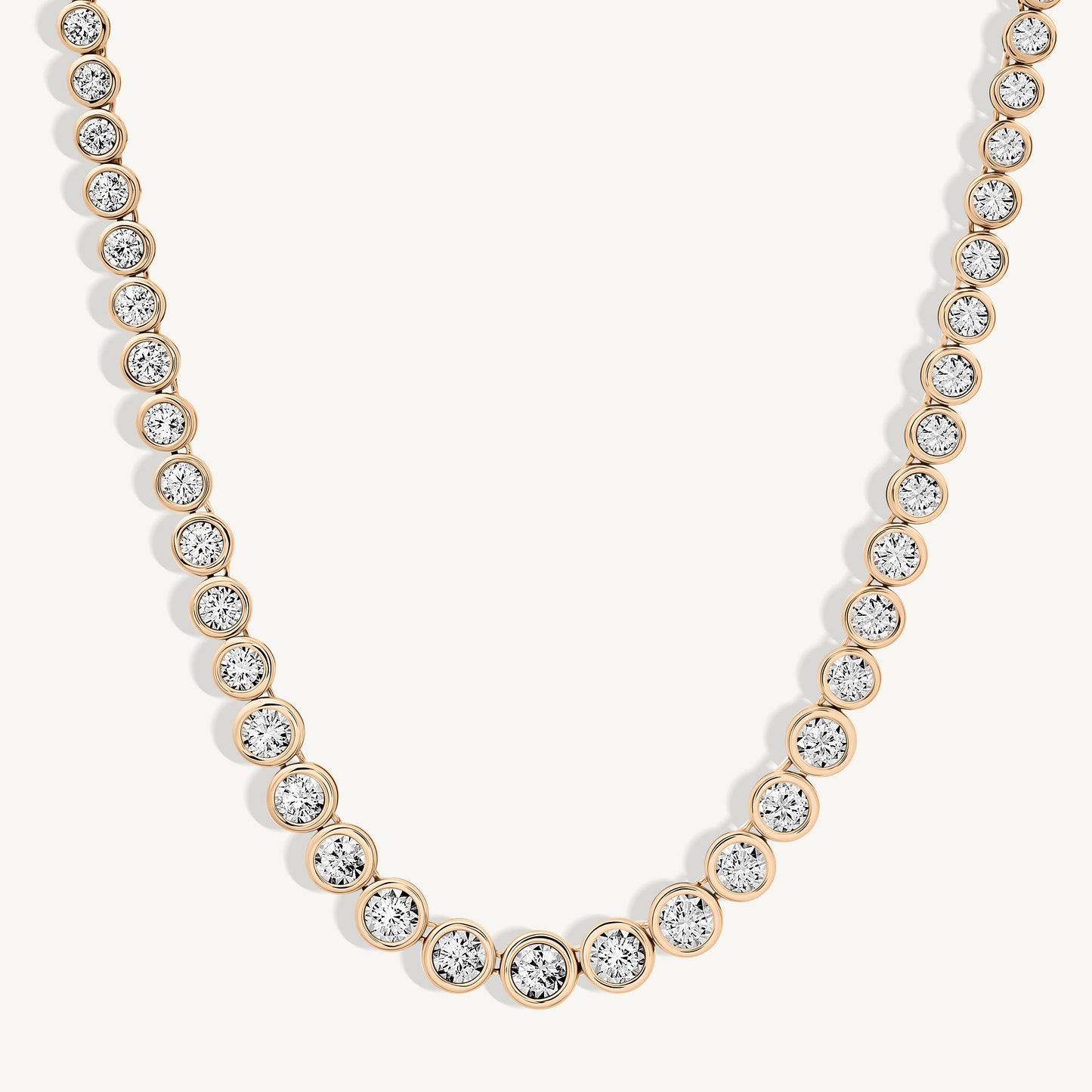 A modern interpretation of classic luxury, the Bezel-Set Graduated Round Diamond Tennis Necklace features a refined sequence of round brilliant-cut diamonds, gracefully transitioning in size to create a stunning graduated effect. The sleek bezel setting enhances the diamonds' natural brilliance while offering a contemporary, seamless aesthetic.