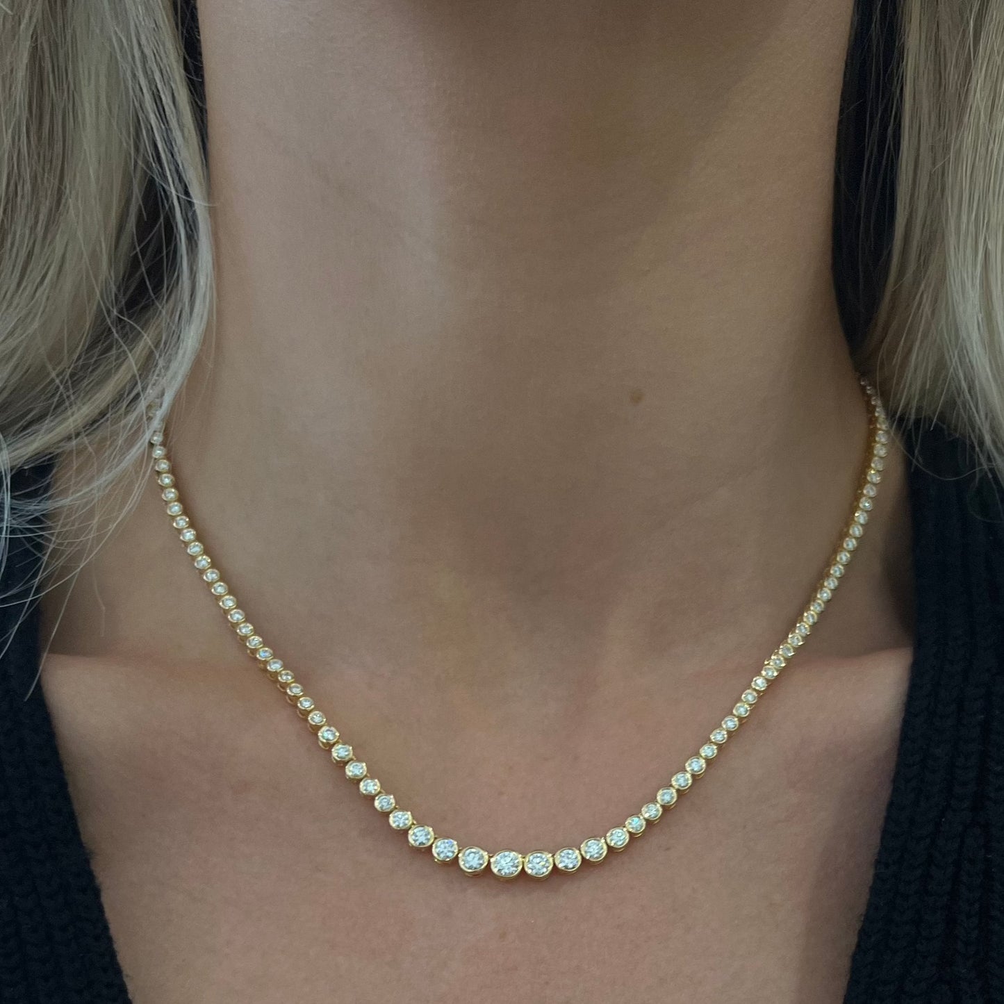 Handcrafted in 18K yellow, white, or rose gold, this exquisite piece sits perfectly along the collarbone, making it an elevated essential for any occasion. Whether worn as a standalone statement or layered for a bold look, the Bezel-Set Graduated Round Diamond Tennis Necklace is a timeless symbol of sophistication and refinement.