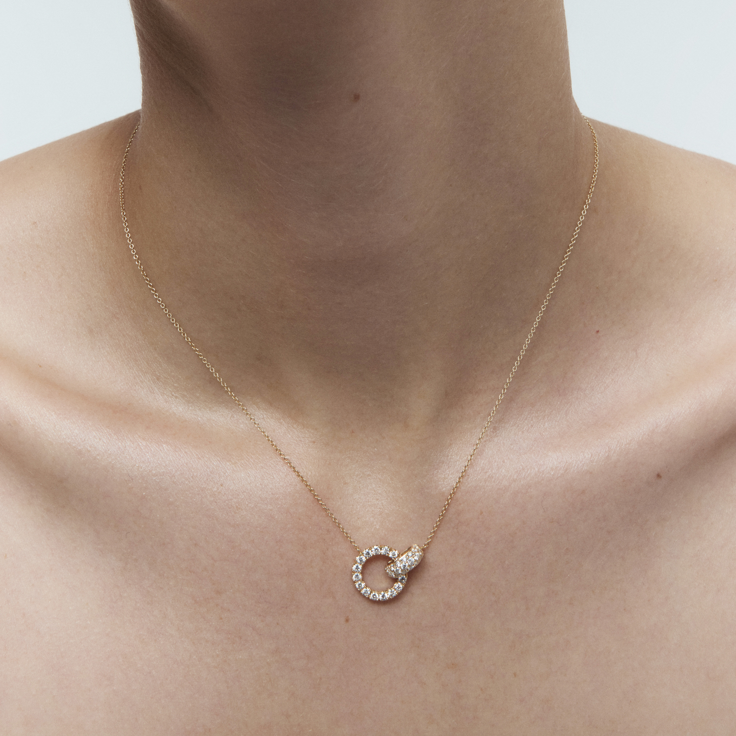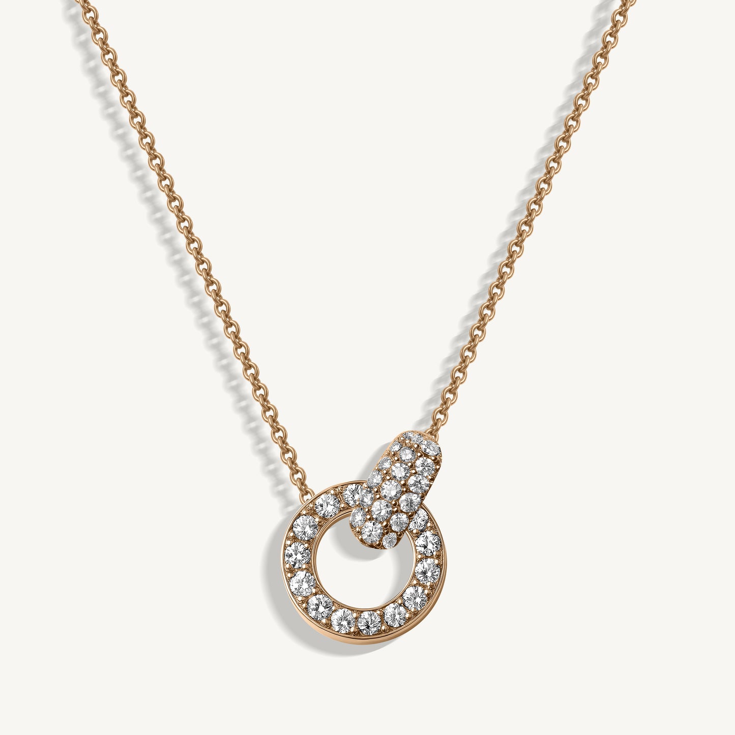 Understated yet striking, the Pavé Diamond Interlock Necklace is a modern emblem of connection and strength. Two interlocking forms, one circular, one curved — are pavé-set with natural diamonds, creating a seamless play of light and form.