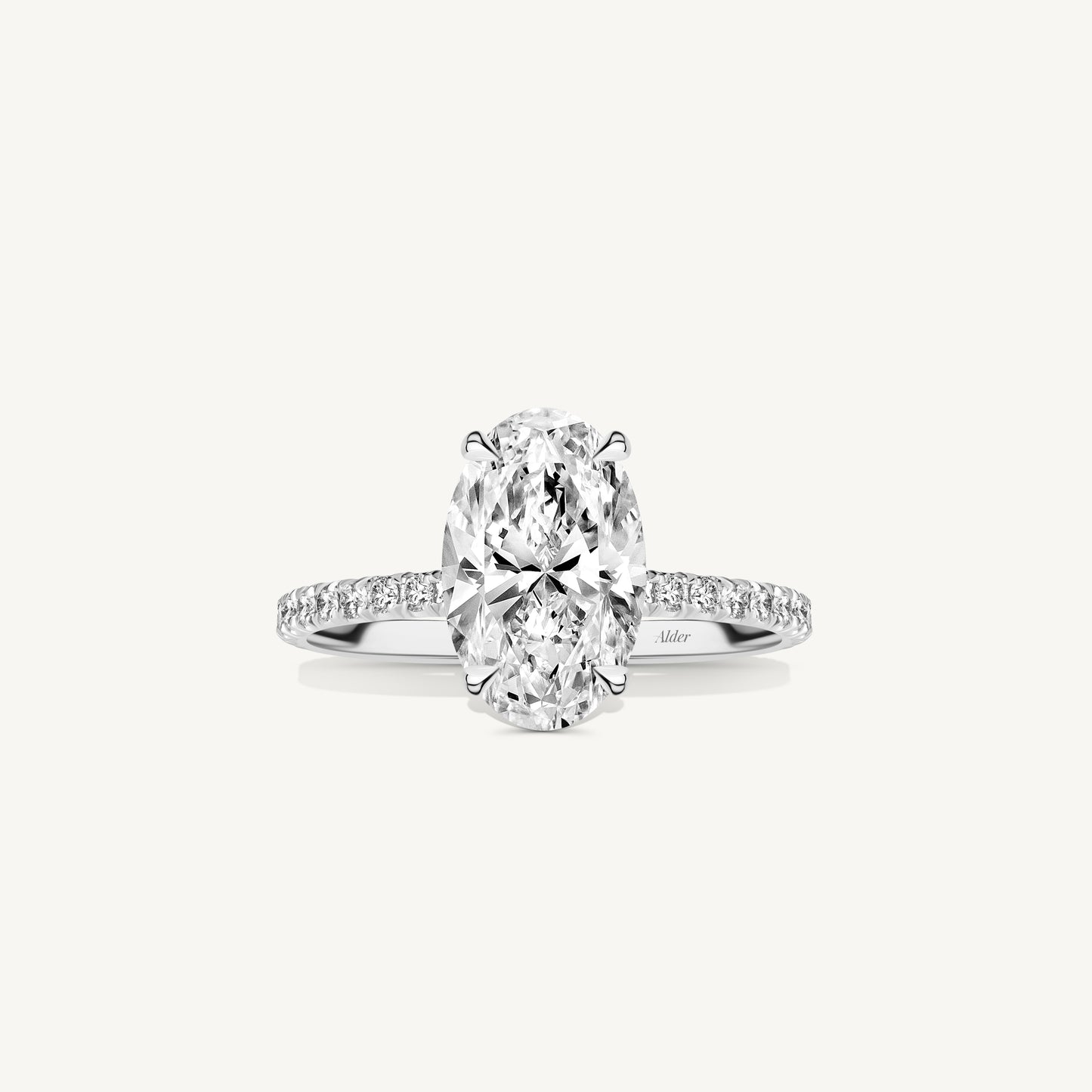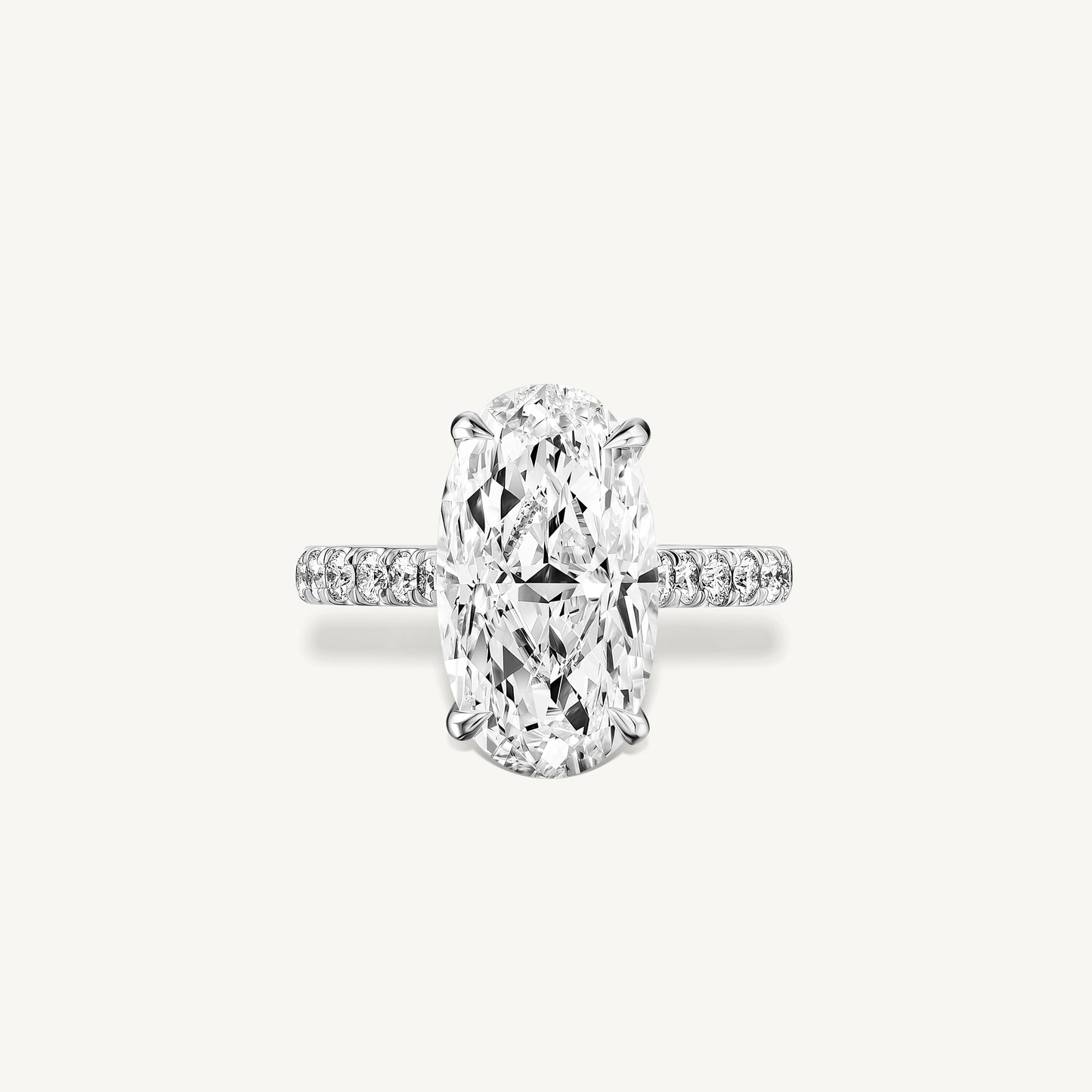 This exquisite oval-cut diamond solitaire is expertly set in a handcrafted four-prong mounting. Featuring a delicate narrow band adorned with French pavé-set accent diamonds, this timeless design enhances the center stone's natural brilliance. A petite basket halo of colourless round brilliant diamonds adds a touch of elegance and sparkle, making this piece truly captivating.