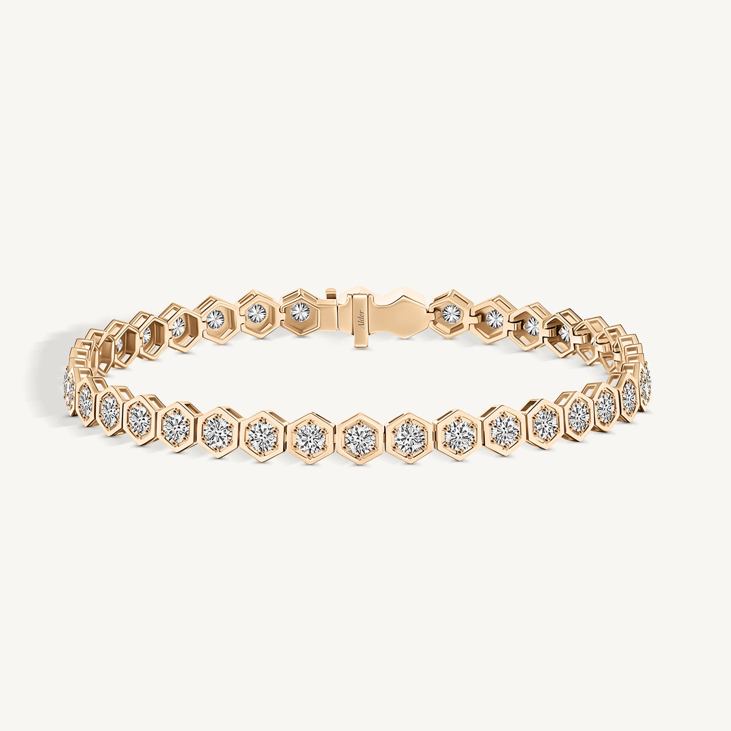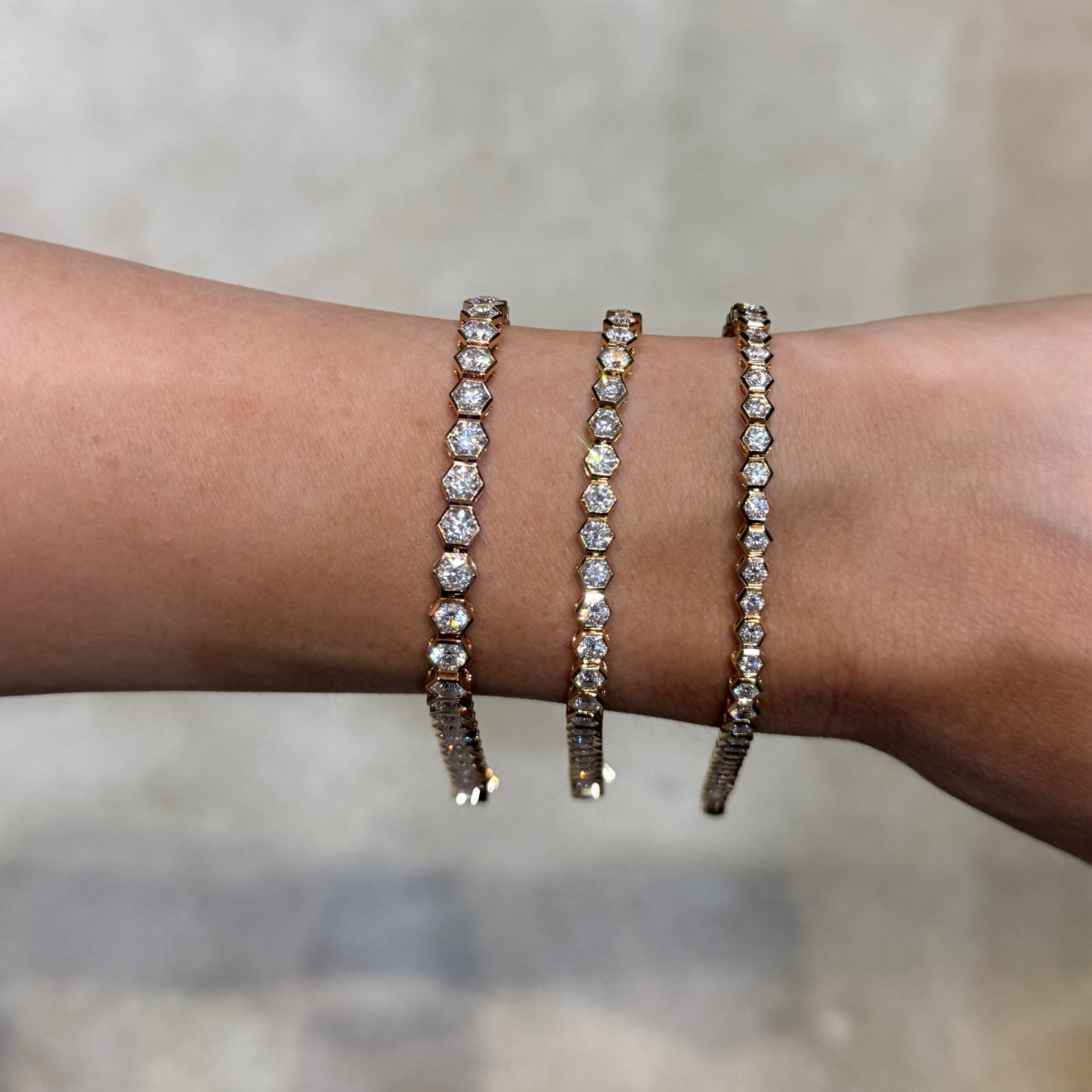A modern twist on a timeless classic, our signature tennis bracelet features a seamless row of round brilliant diamonds, each encased in a sleek hexagon-shaped bezel setting. Crafted in your choice of 18K yellow, rose, or white gold, this piece offers a perfect balance of bold geometry and refined elegance. The 2.8mm round diamonds total approximately 3 carats, delivering a captivating sparkle that’s made to be worn – and loved – every day.